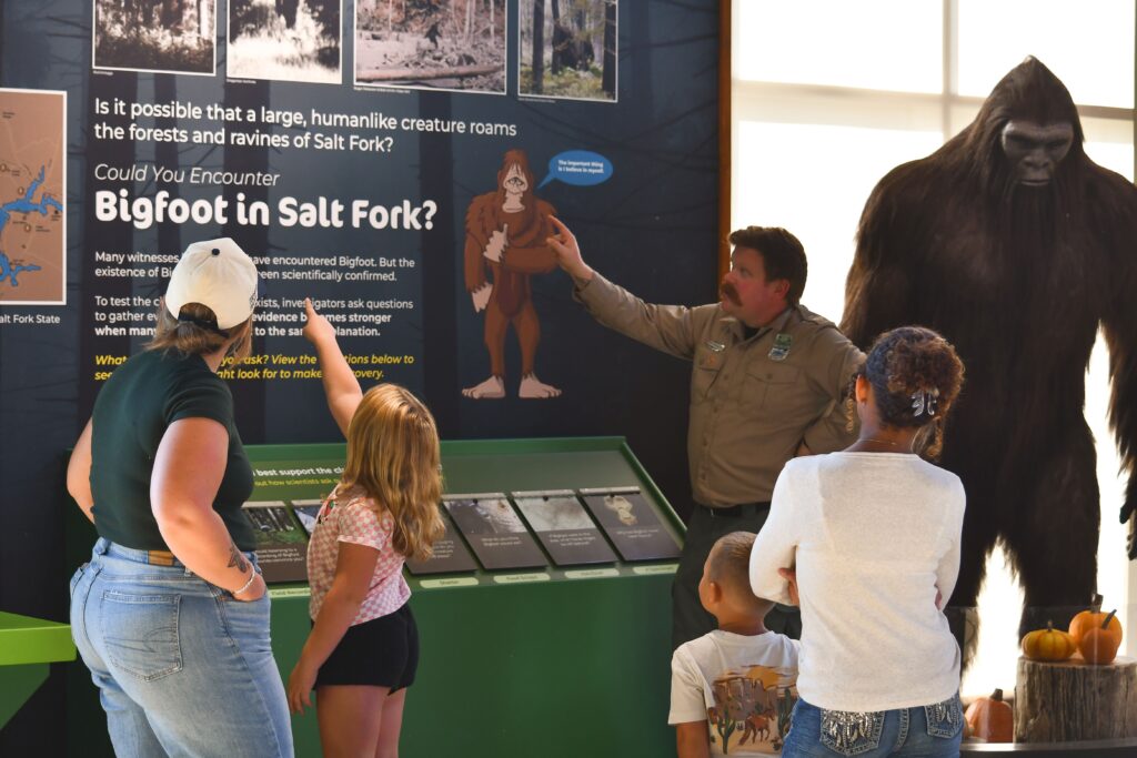 Not far from the lodge is the brand-new Eco-Discovery Center (opened in 2025), dedicated to teaching children about conservation and sustainability. Bigfoot serves as a character guide throughout the building, highlighting fun facts and teaching visitors that, despite his big feet, he tries to keep his environmental footprint small. The exhibits engage visitors in an interactive journey through Salt Fork’s forest ecosystem to discover how everything in nature is connected.